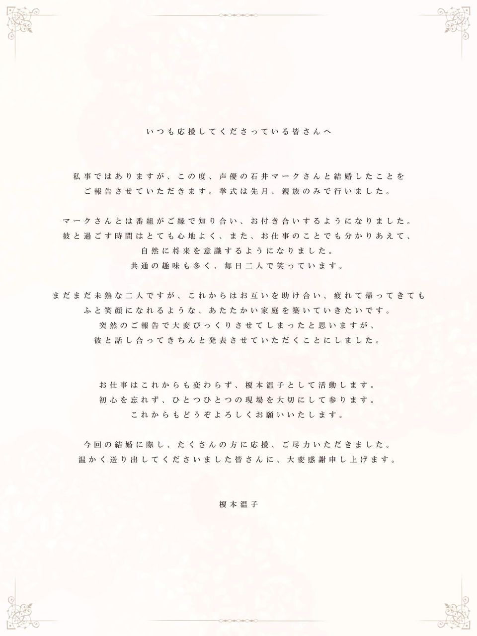 【石井マーク、榎本温子】結婚したことを報告 榎本温子から皆さんへ大切なお知らせです。